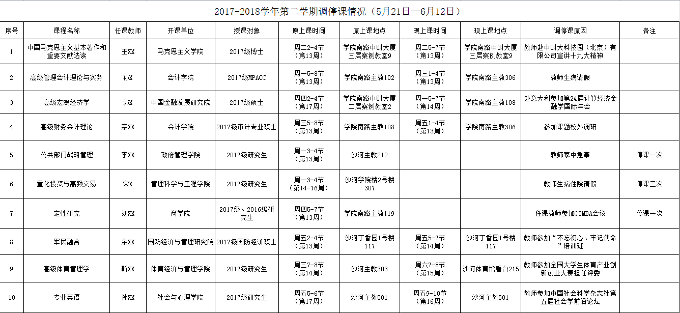 2017-2018学年第二学期调停课情况(5月21日—6月12日)