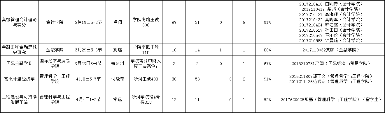 为落实研究生教学常规管理,根据《中央财经大学研究生教学管理规定》(校发﹝2017﹞159号)、《关于实施研究生教学检查与现场听课月报制度的通知》(研字〔2017〕69号),我校于2017年10月份正式实施研究生教学检查与现场听课月报制度,现将2018年3月份各单位上报教学检查缺勤情况进行通报: