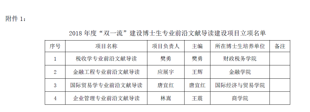 根据《关于组织开展2018年度“双一流”建设博士生专业前沿文献导读建设项目的通知》(研字〔2018〕14号),研究生院组织评审专家对2018年度申报的6个“博士生专业前沿文献导读”建设项目进行立项评审。经评审,《国际贸易学专业前沿文献导读》等4个项目获准立项,学校对拟立项项目进行了公示,现公示期满,正式立项。