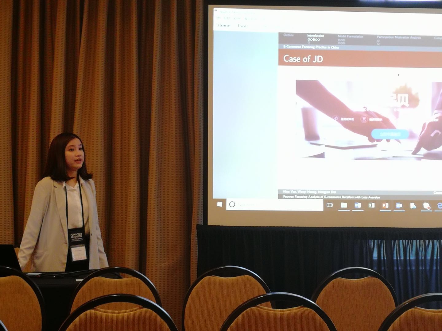 商学院研究生黄文怡参与了此次会议,并在供应链与互联网金融主题(Supply chain and internet finance)报告中作题为《Reserve Factoring Analysis of E-commerce Retailers with Loss Aversion》的学术报告。研究基于中国互联网金融实践案例,通过数学建模的方法对当下适用广泛互联网反向保理融资模式进行研究,并同时就电商巨头介入金融服务的影响进行了探讨。黄文怡同学的论文视角新颖、内容丰富、观点鲜明,得到了专家学者的认可。